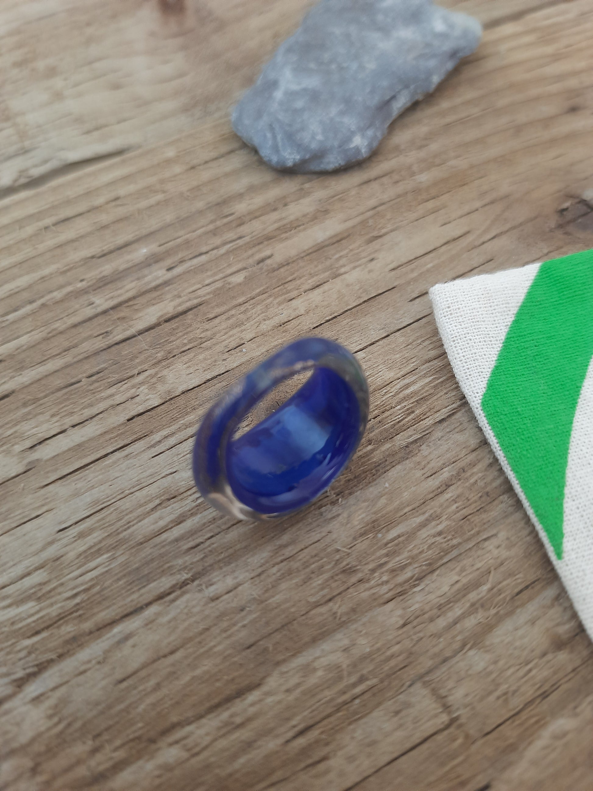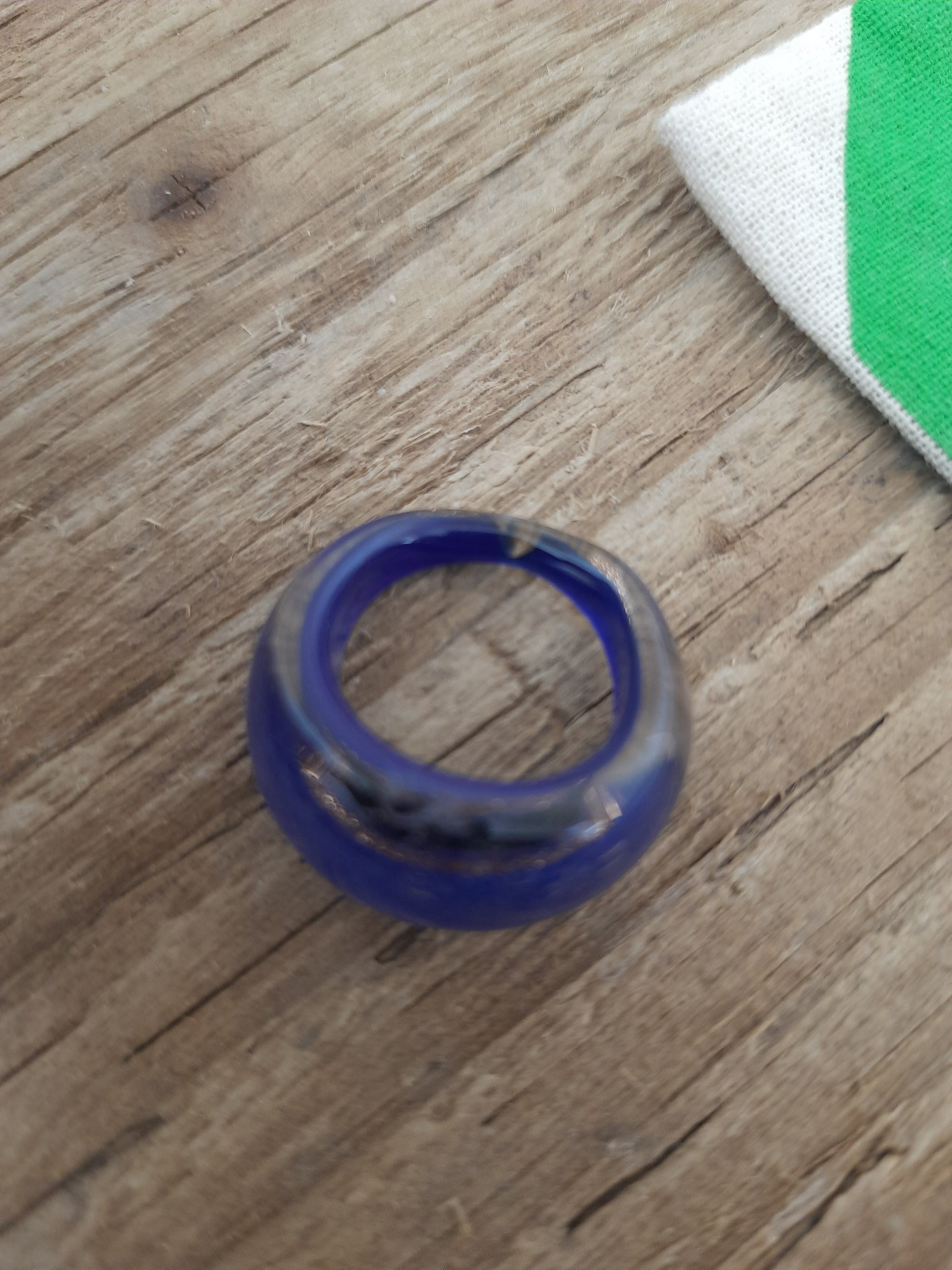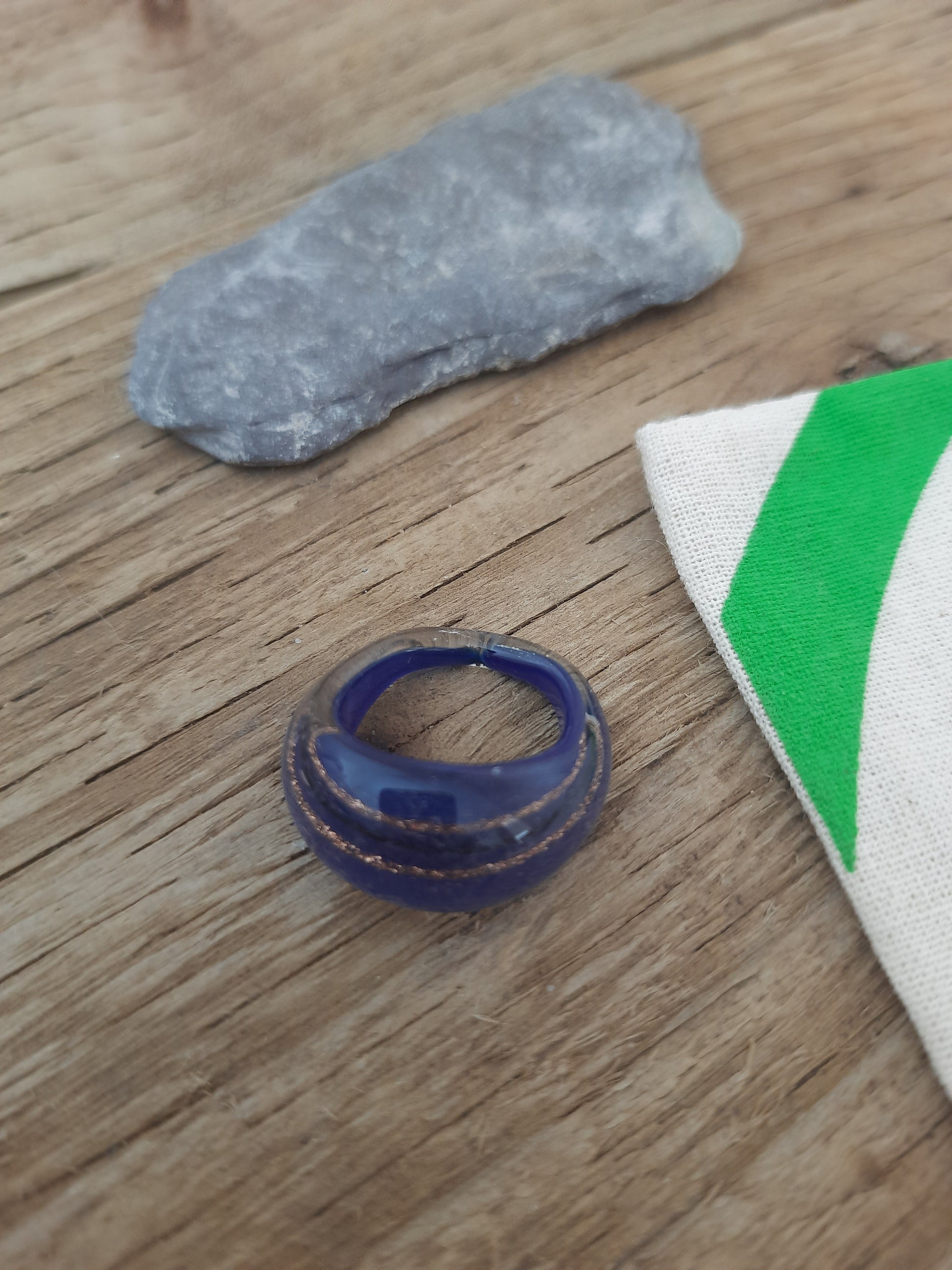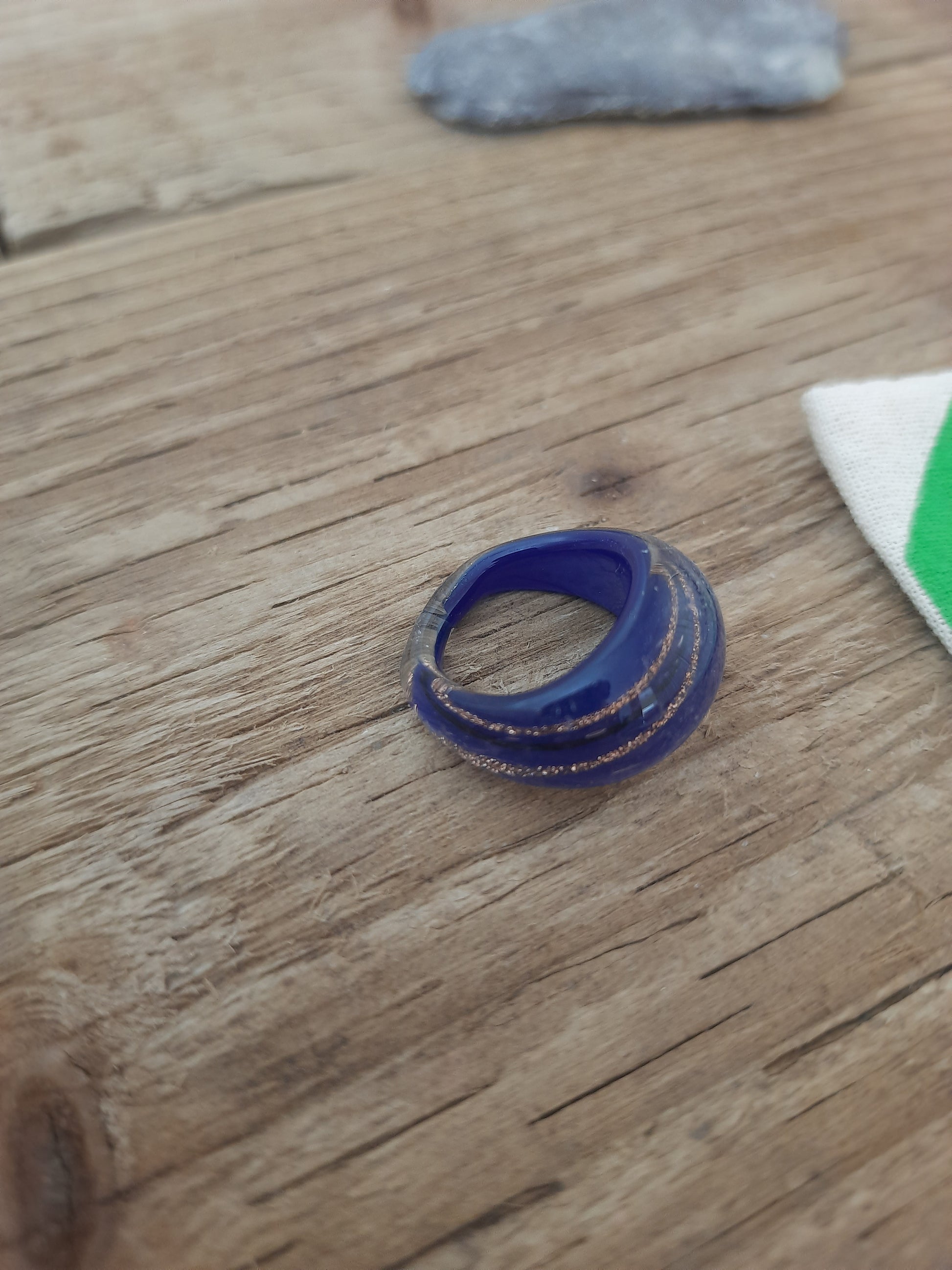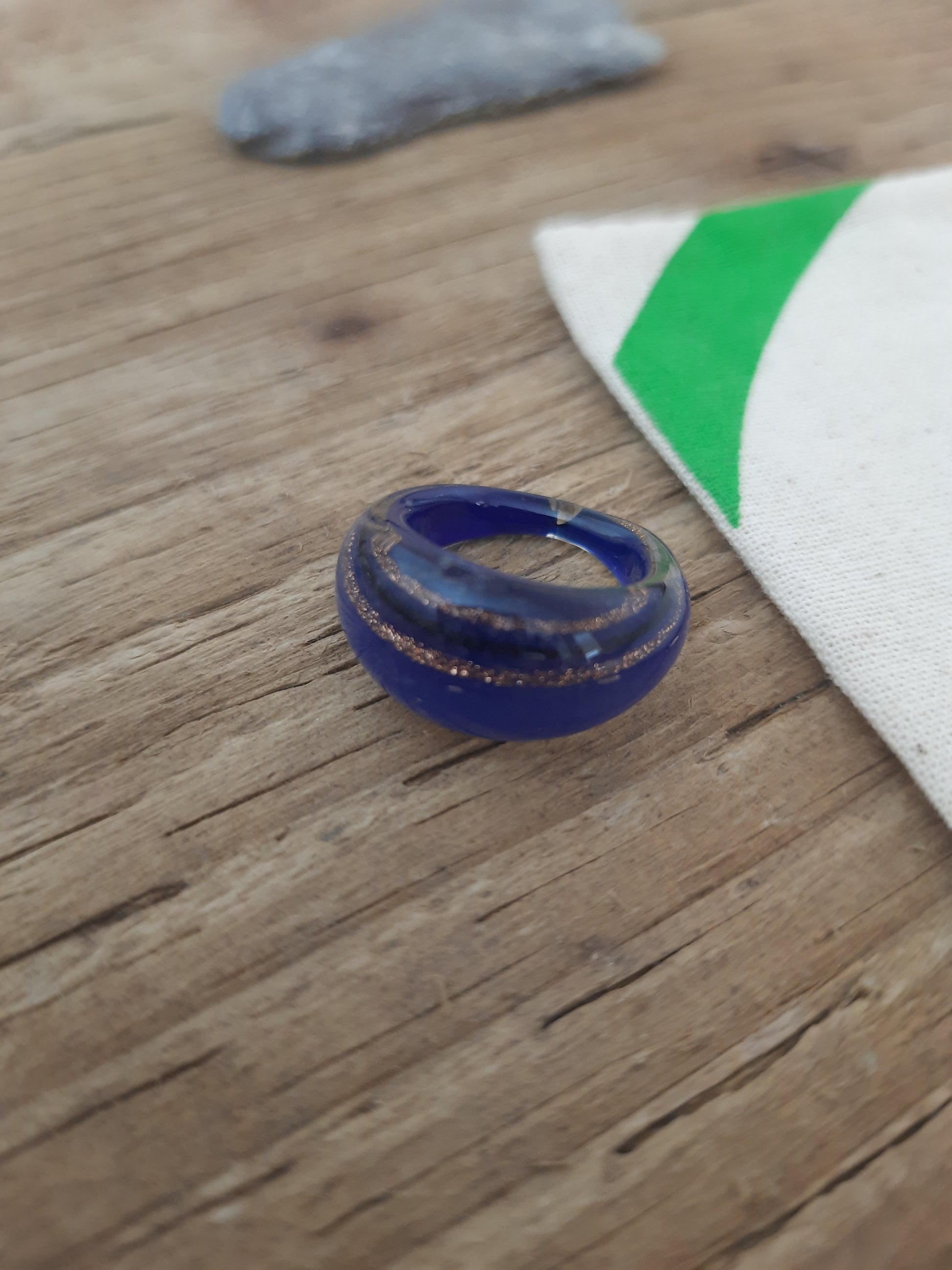 Made from glass this ladies hand ring comes in a beautiful blue theme with a elegant contrasting gold streak across front facial. Fair trade statement jewelry at its best.