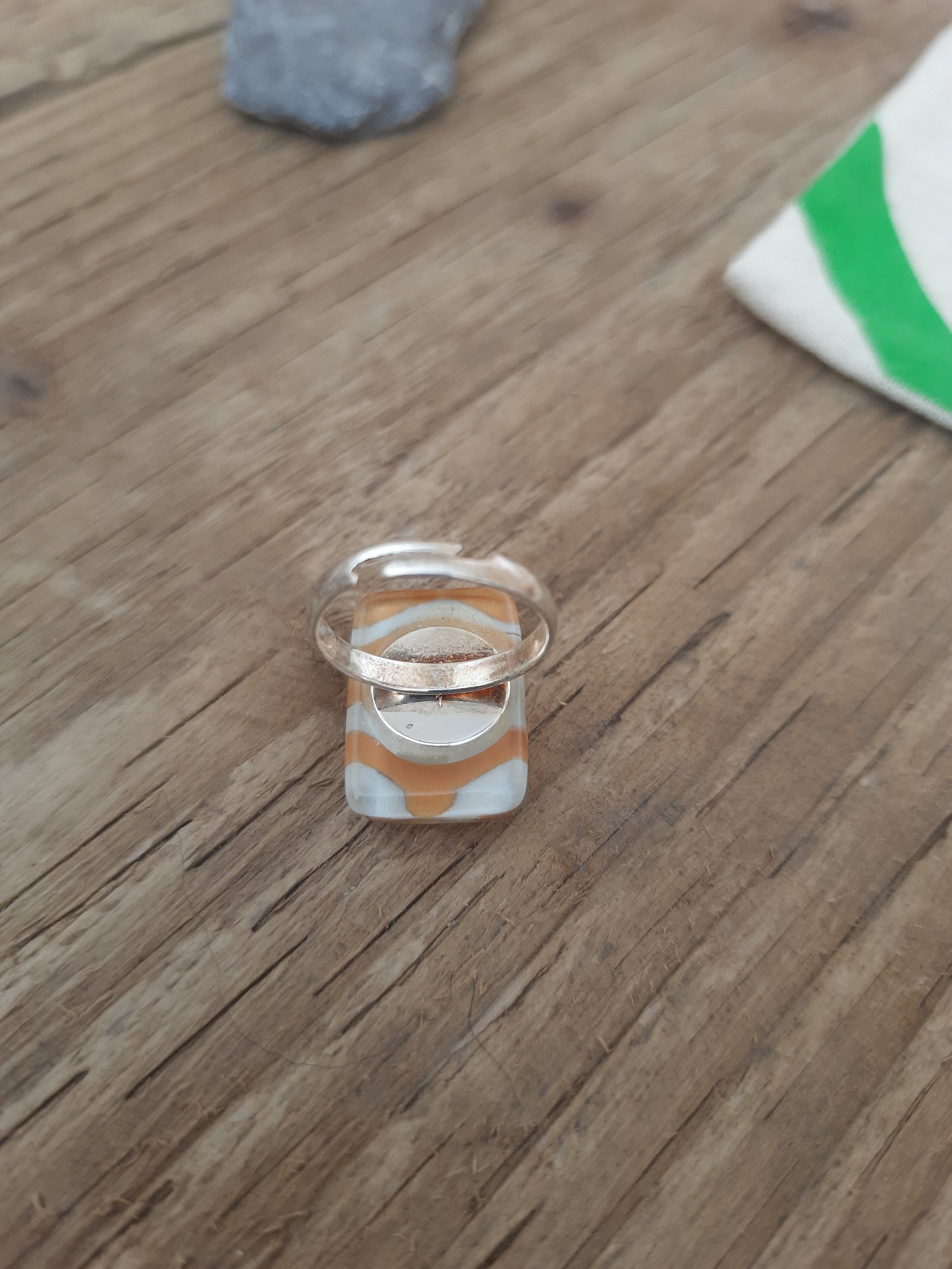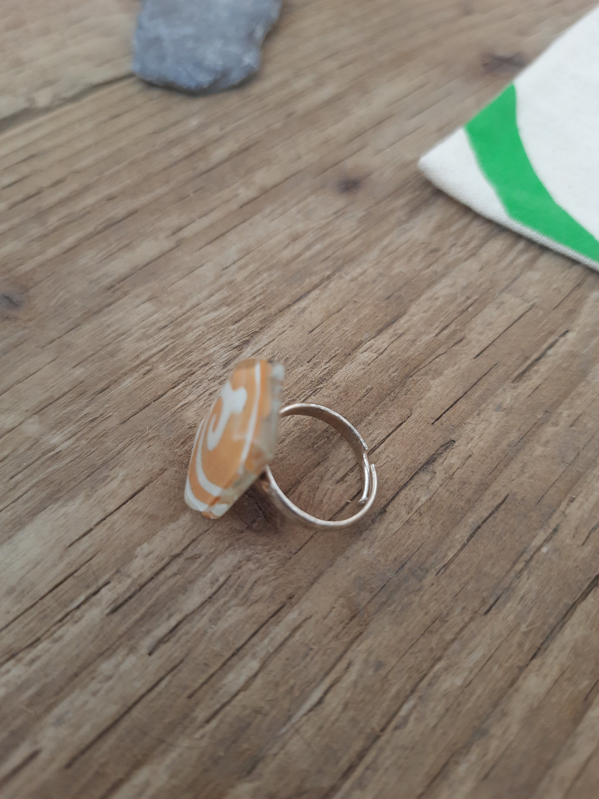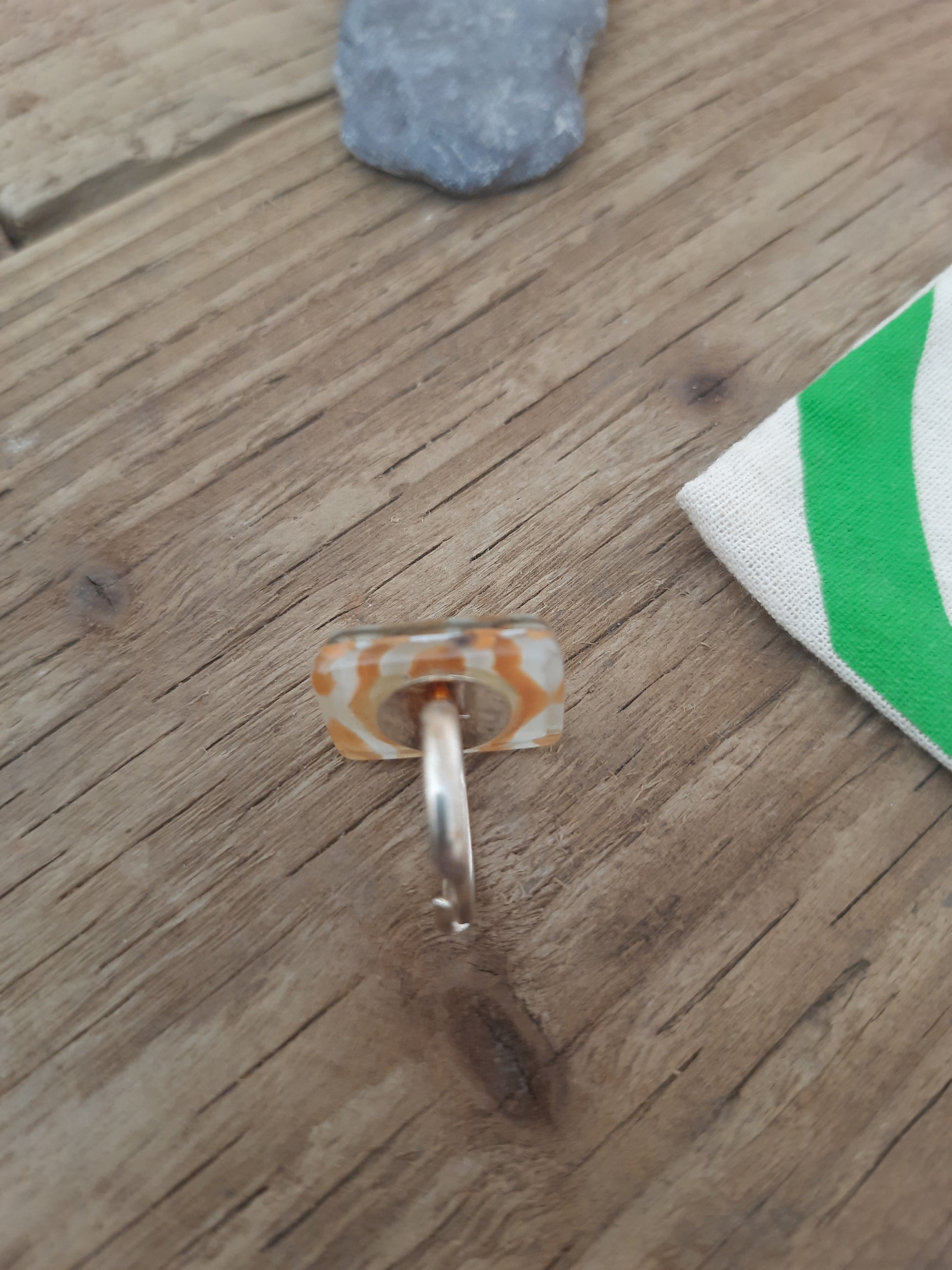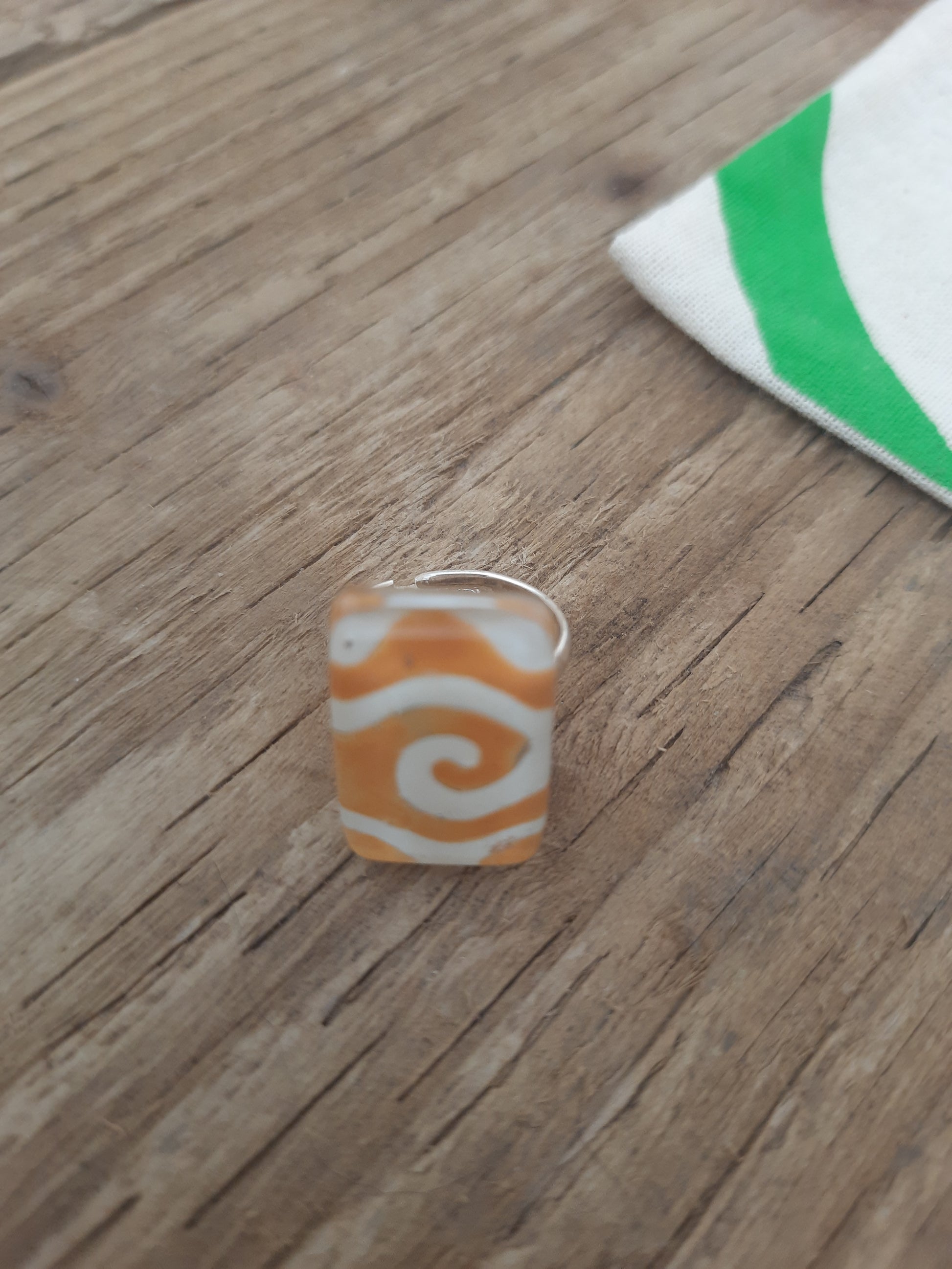 Handmade by skilful artisans and brought to you from India, this subtle browny orange glass ring comes with an element of white with the colours printed in a distinctive whirly design.