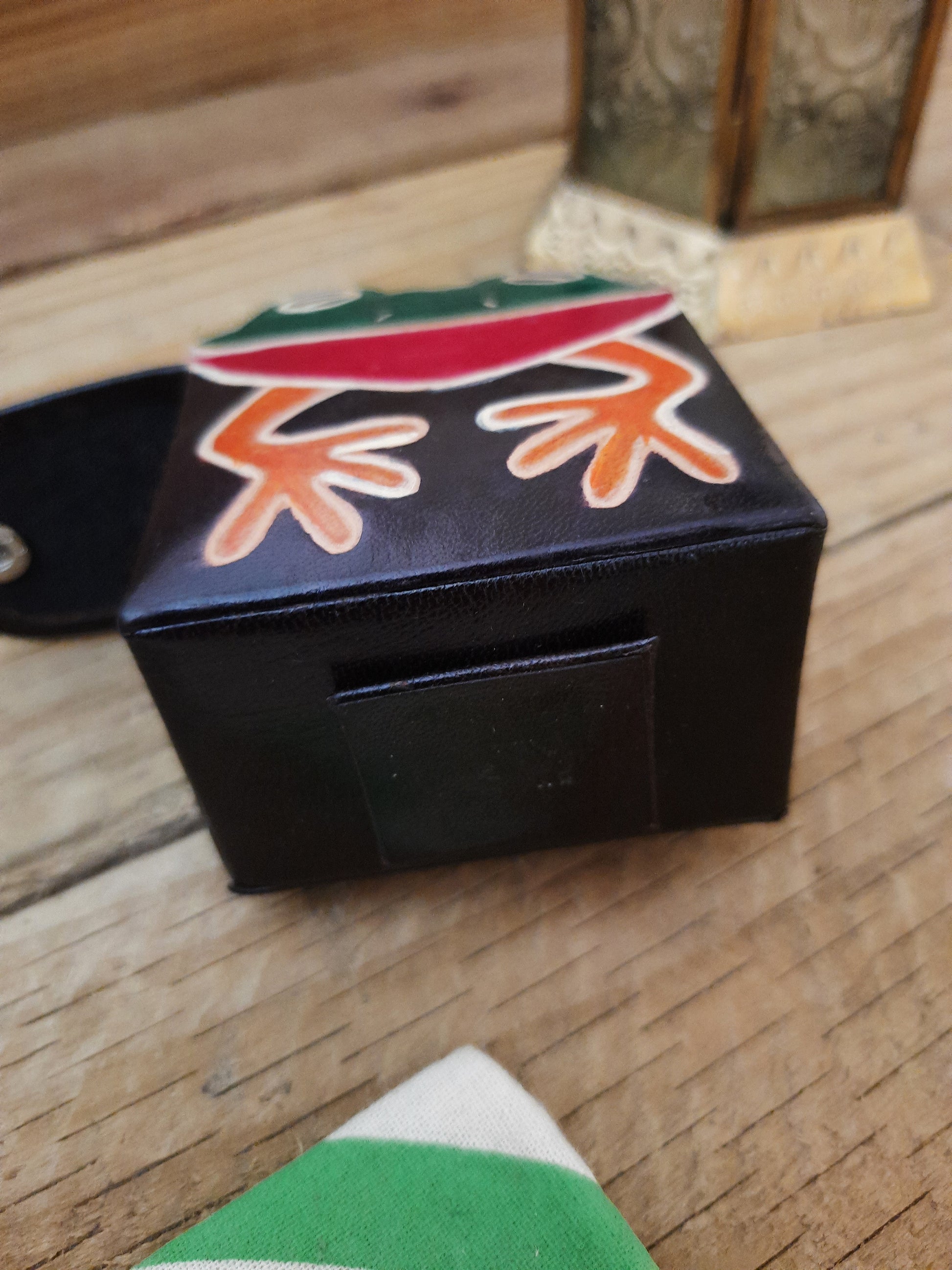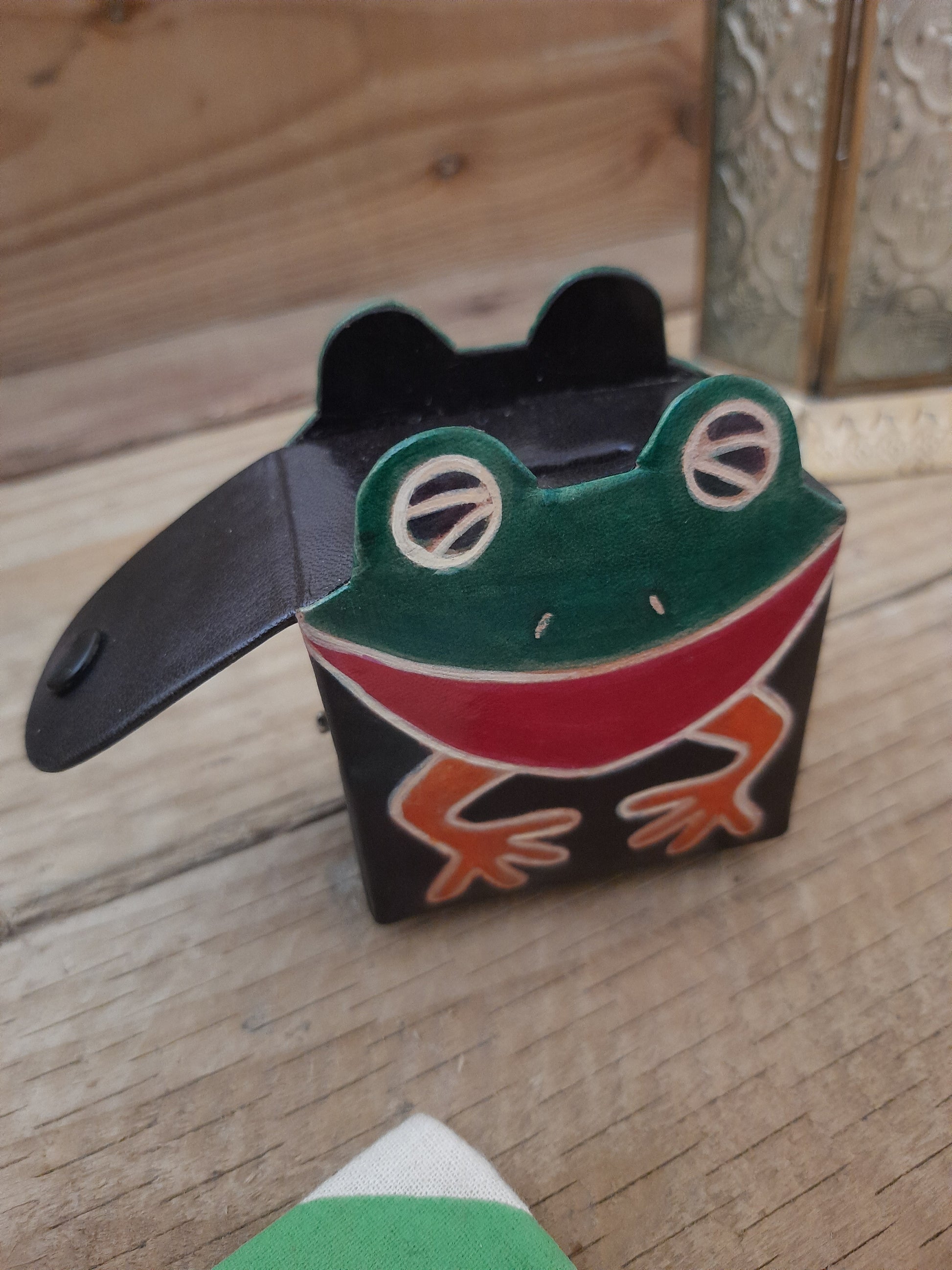 A really cool frog piggy bank made from leather and all handmade by artisans in Indonesia who really have mastered their trade, meticulously and thoughtfully hand painted with care.
