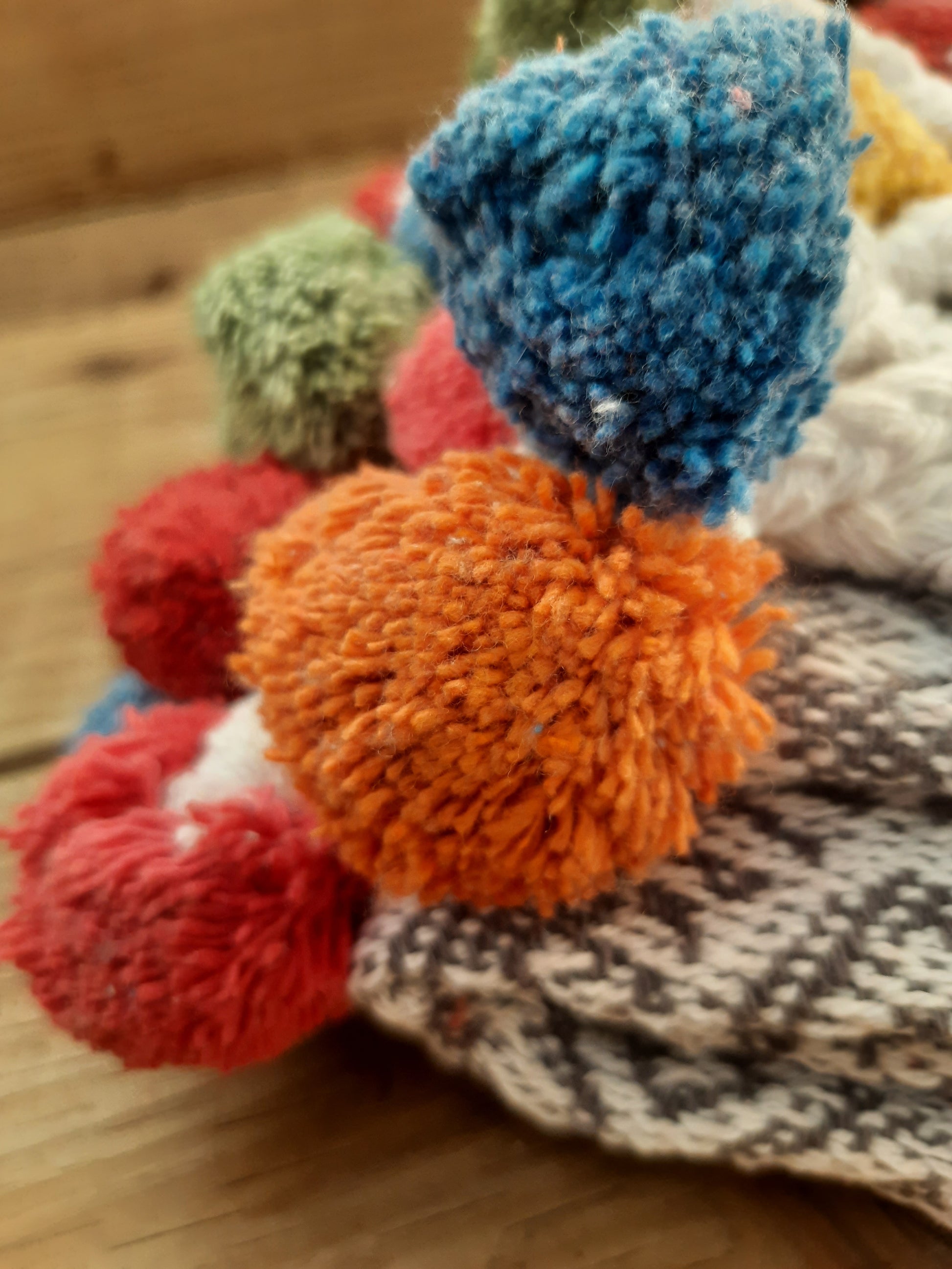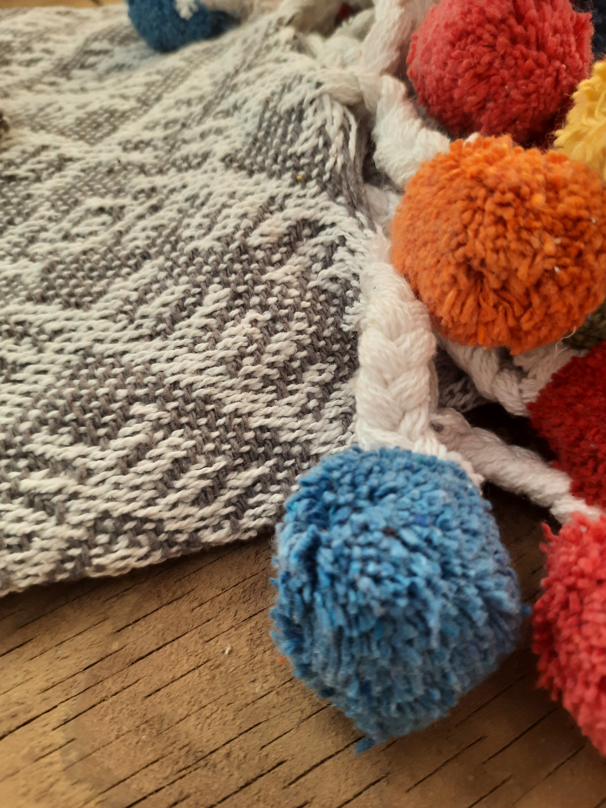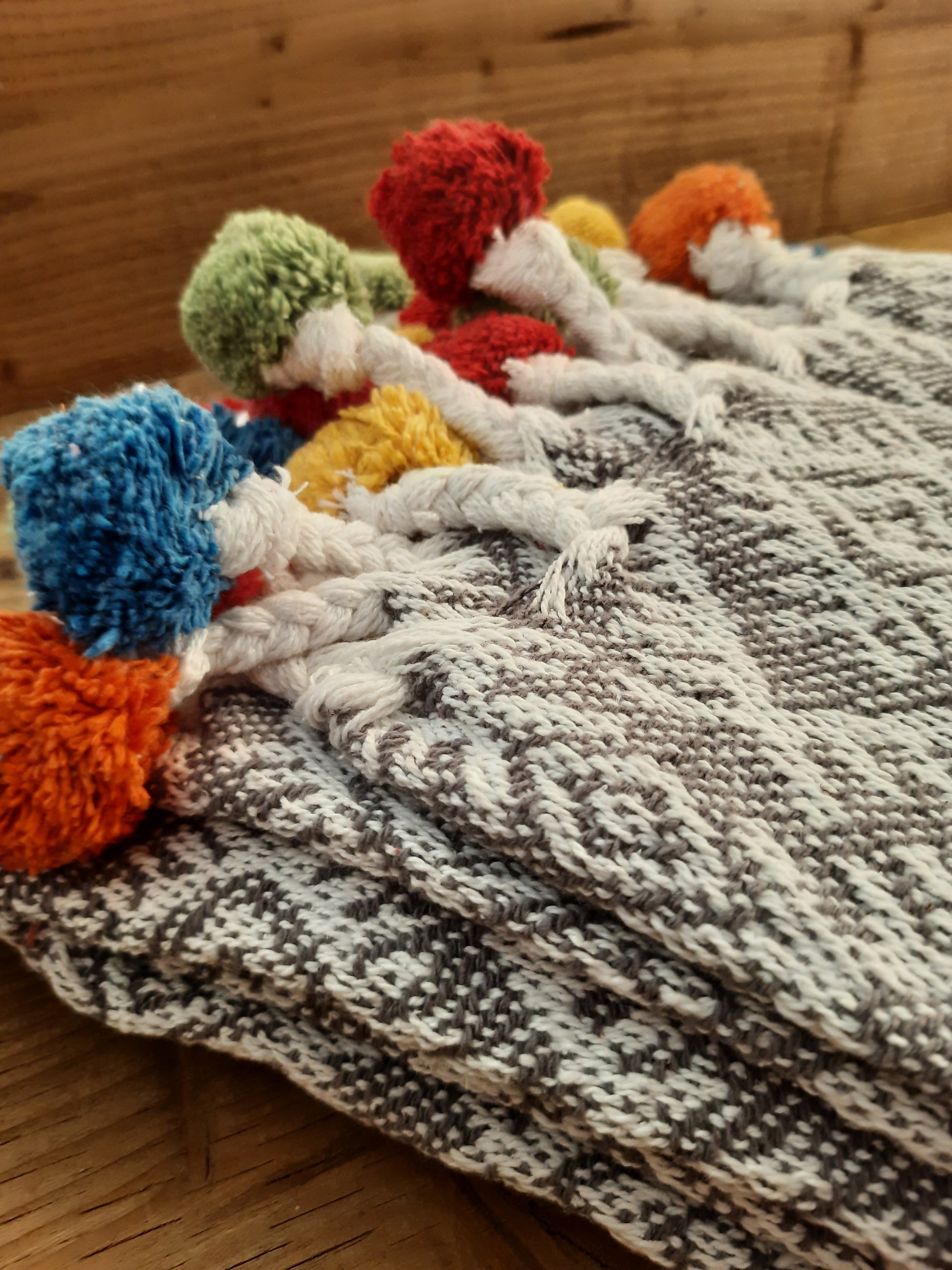 Perfect for draping over your sofa, bed, or armchair, this eco-friendly throw blanket comes in a lovely soothing combination of grey and white with vibrant and colourful soft pom poms and breathable fabric, making it ideal for year-round comfort.