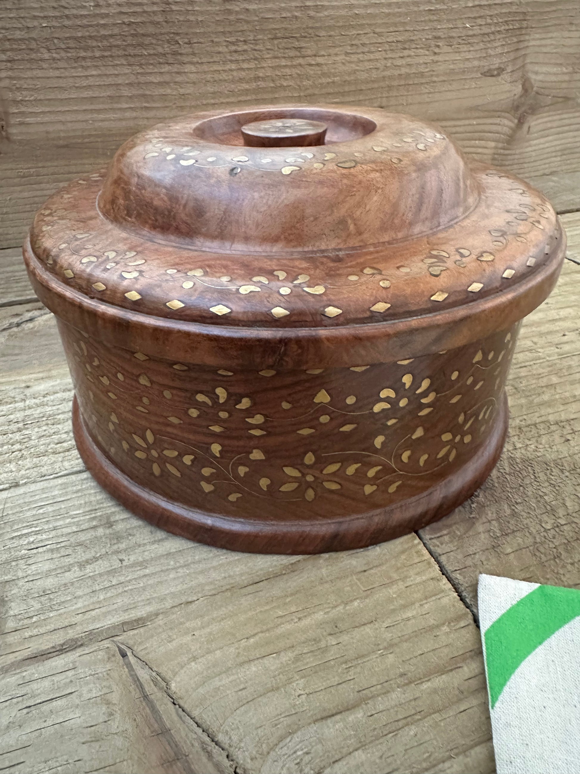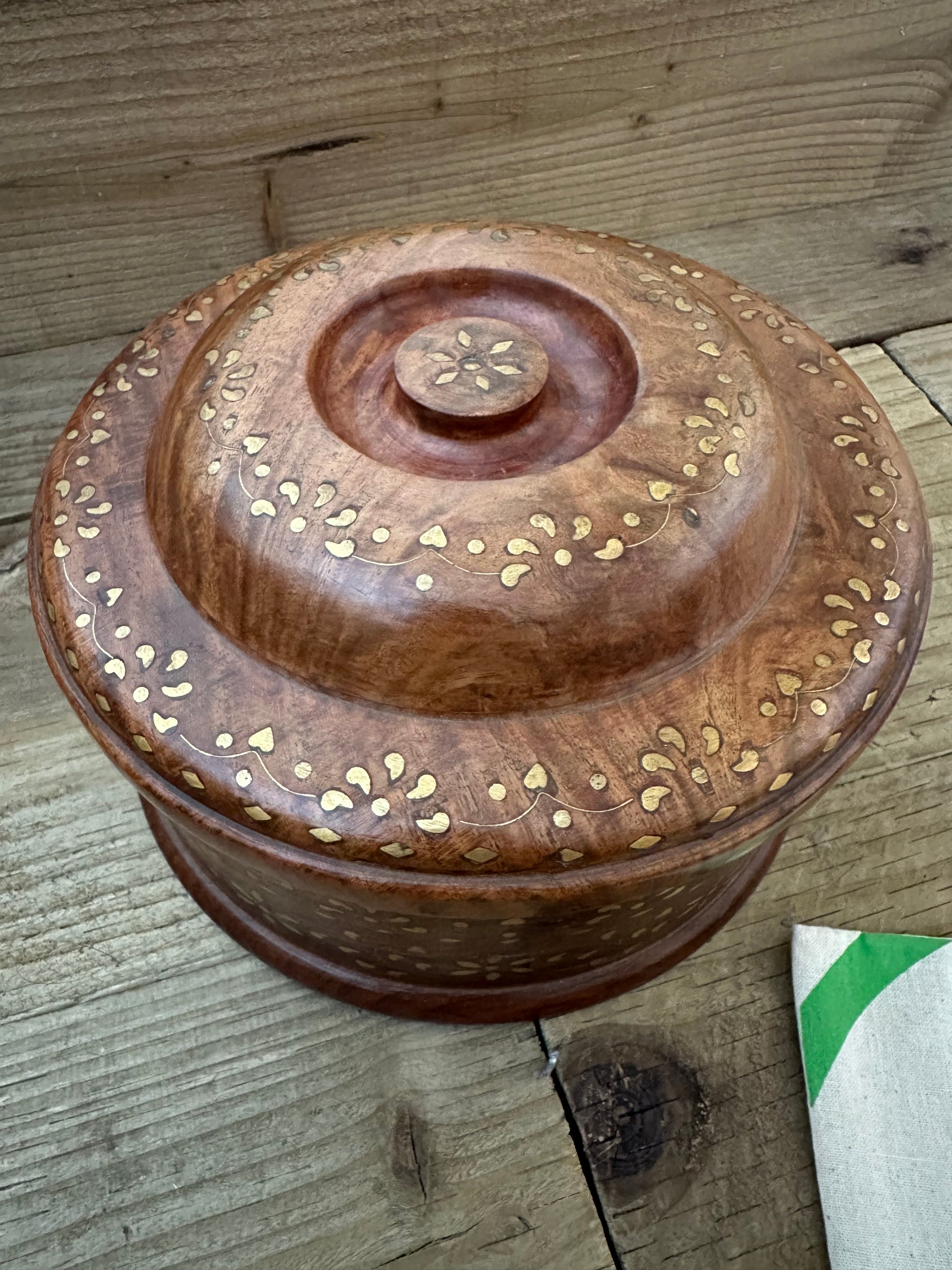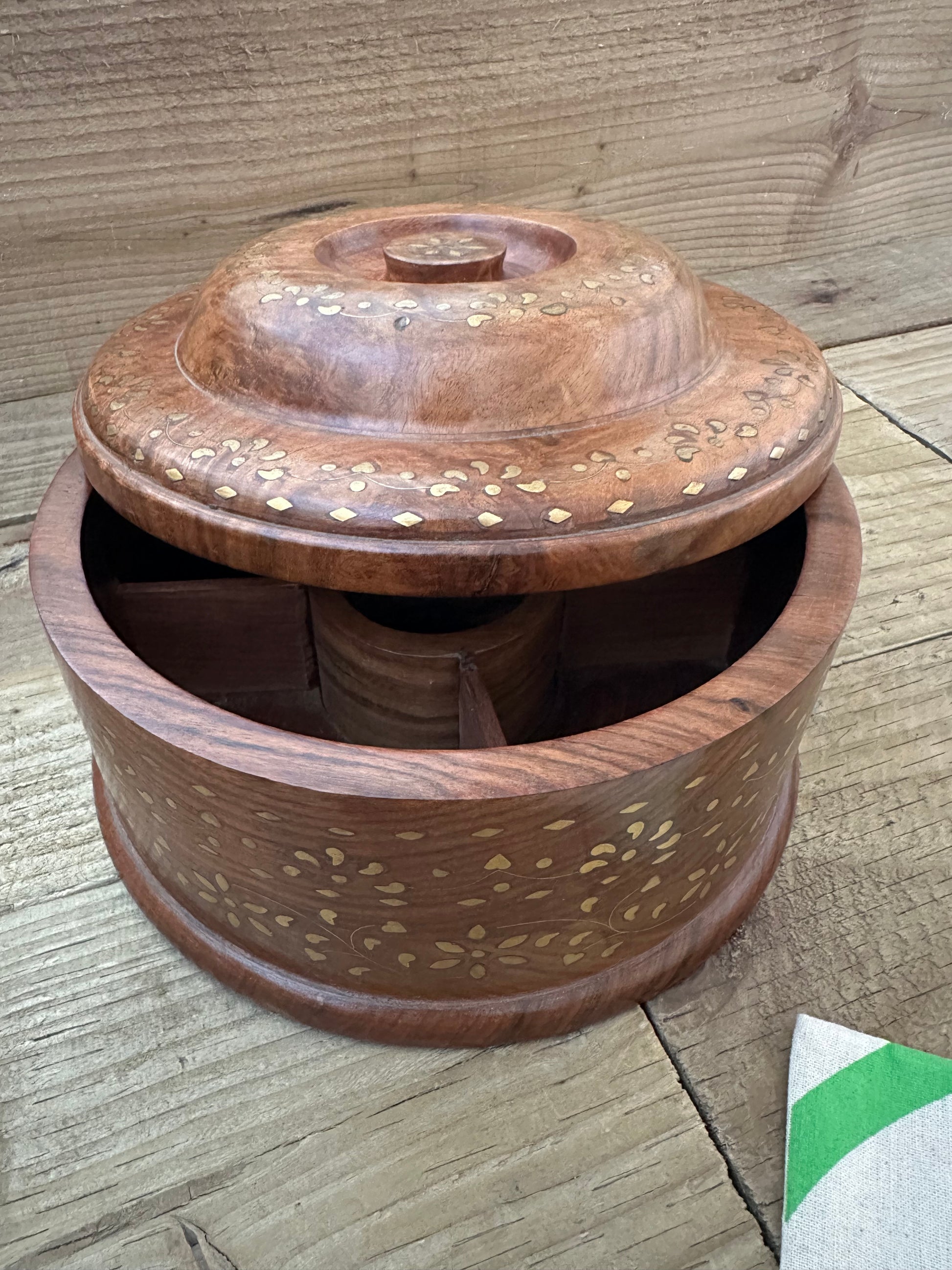 Bold flavour meets timeless craftsmanship in this beautifully handcrafted wooden spice box round with brass inlays.