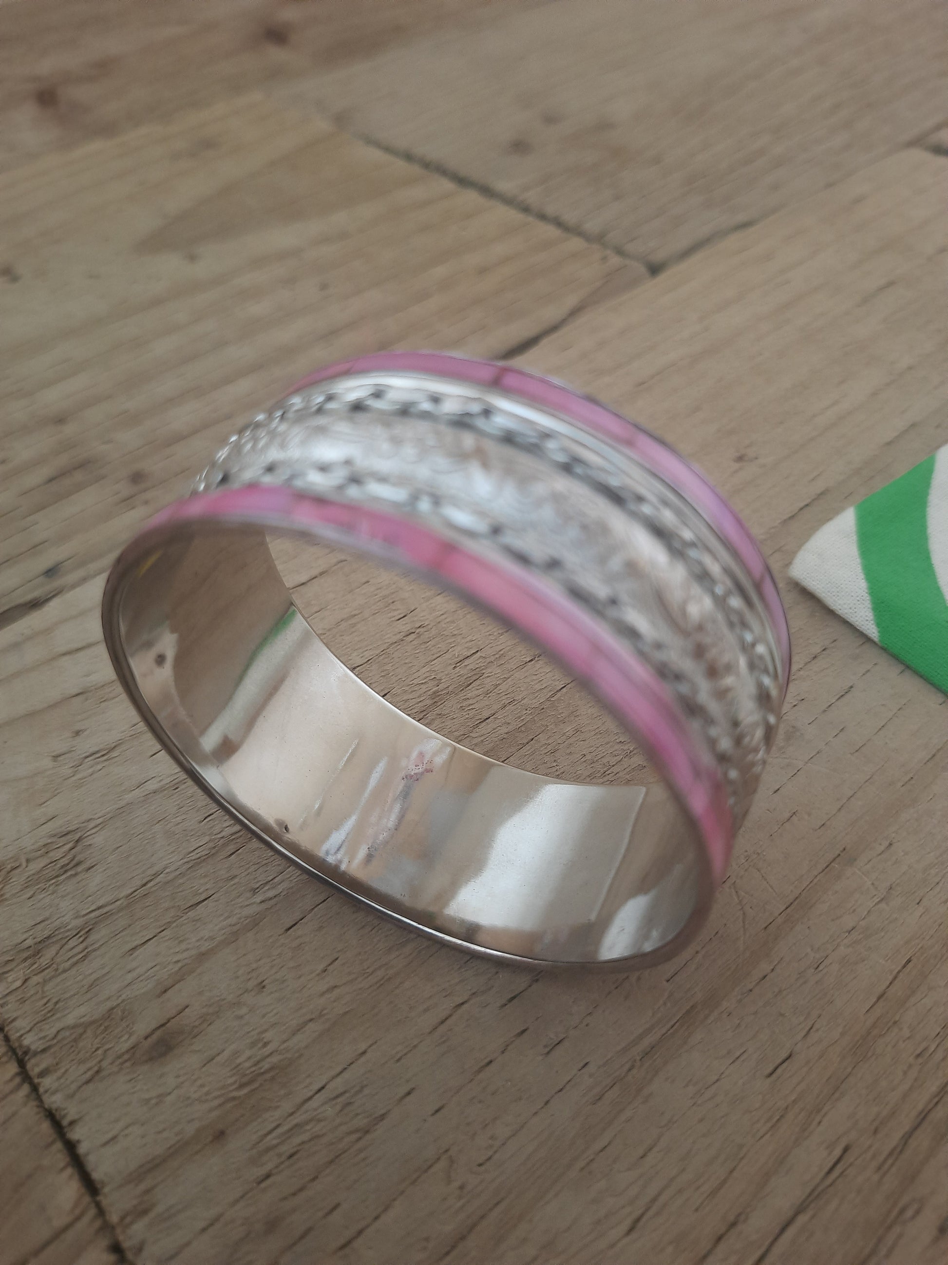 A luxury bangle that comes in a gorgeous colour combination of pink and silver to gives it a distinctive and individualistic look and appeal.