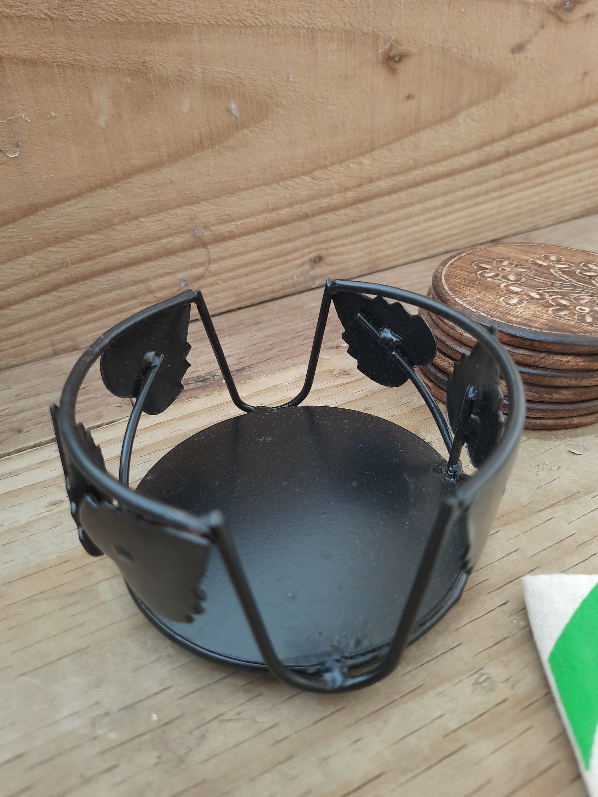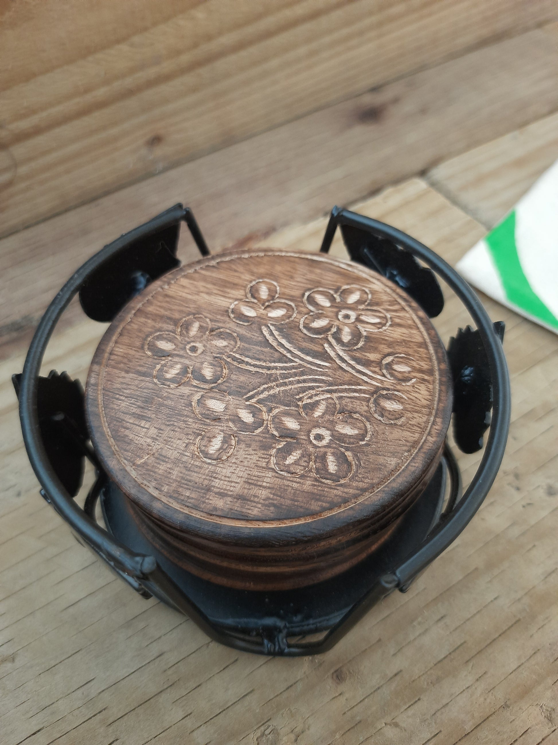 Introducing our exquisite set of 6 round mango wood coasters with floral engravings.