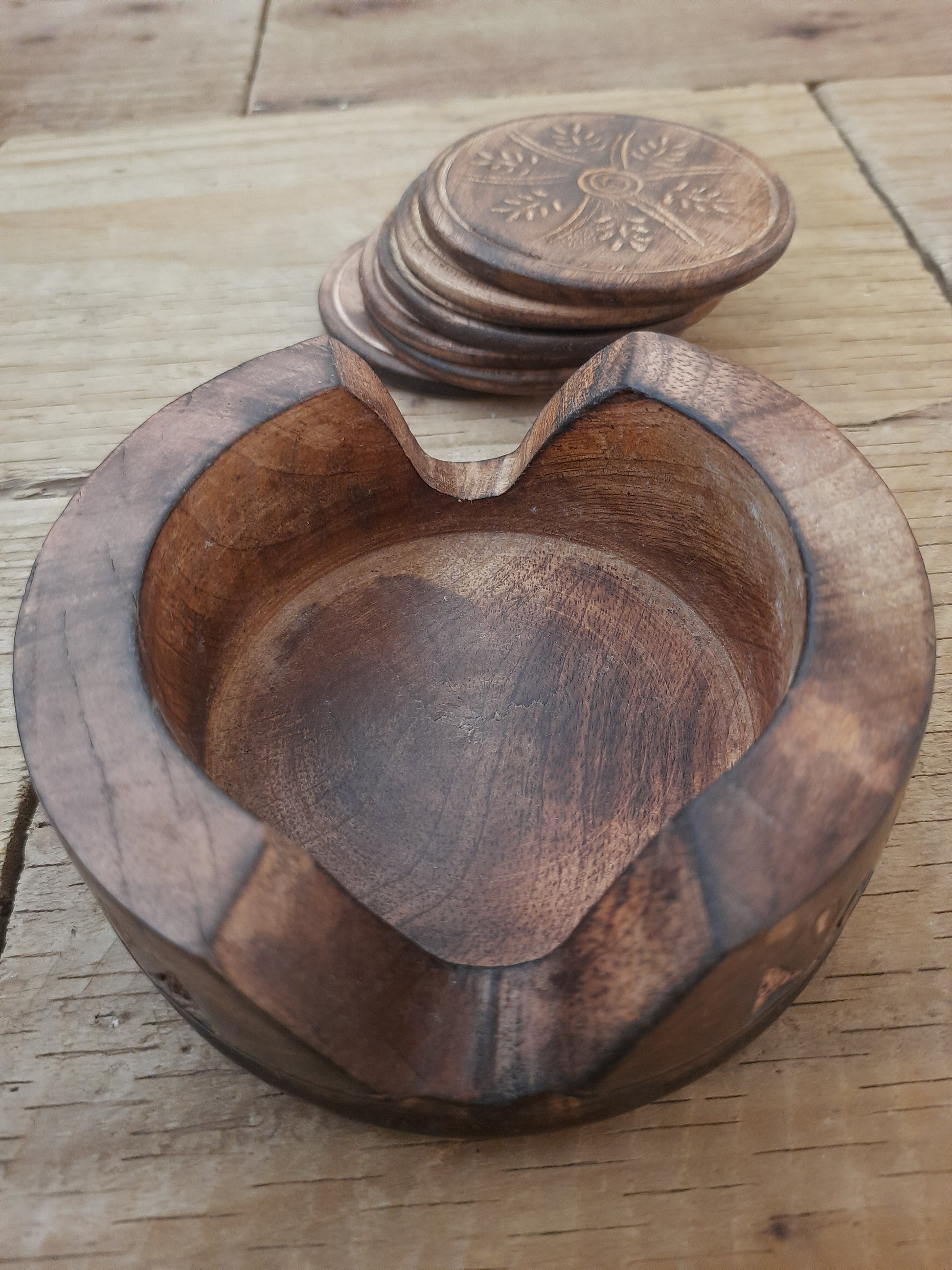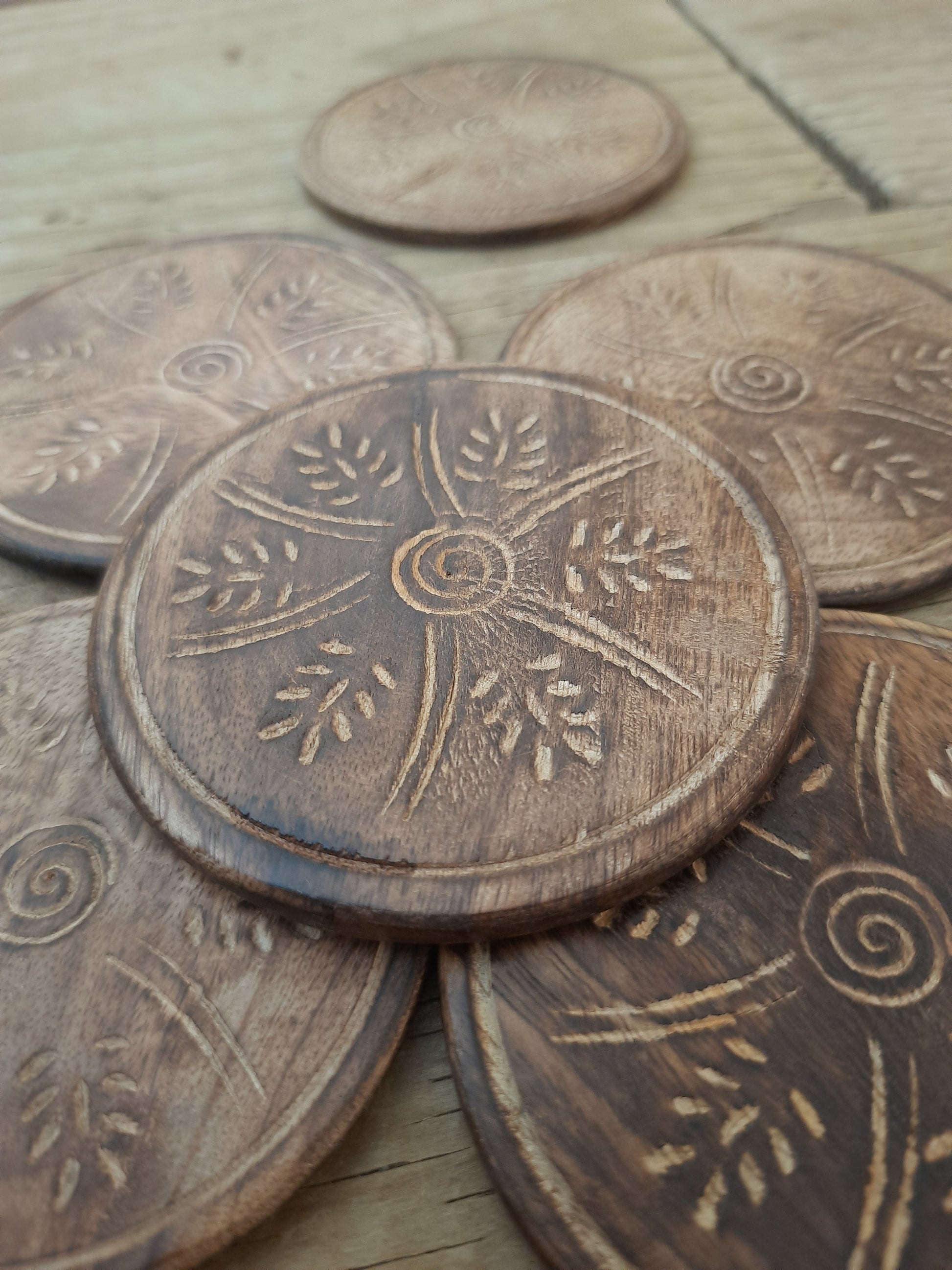 Set of 6 Rustic Mango Wood Coasters with Wooden Holder – Floral Engraved