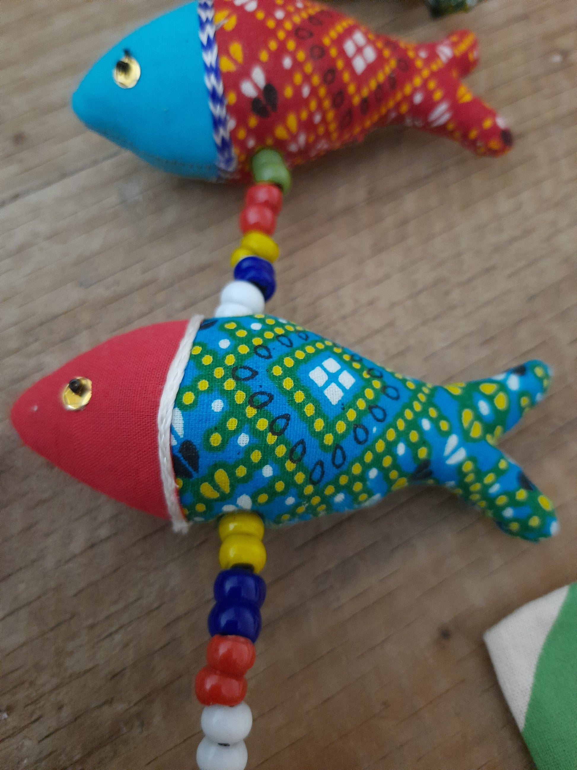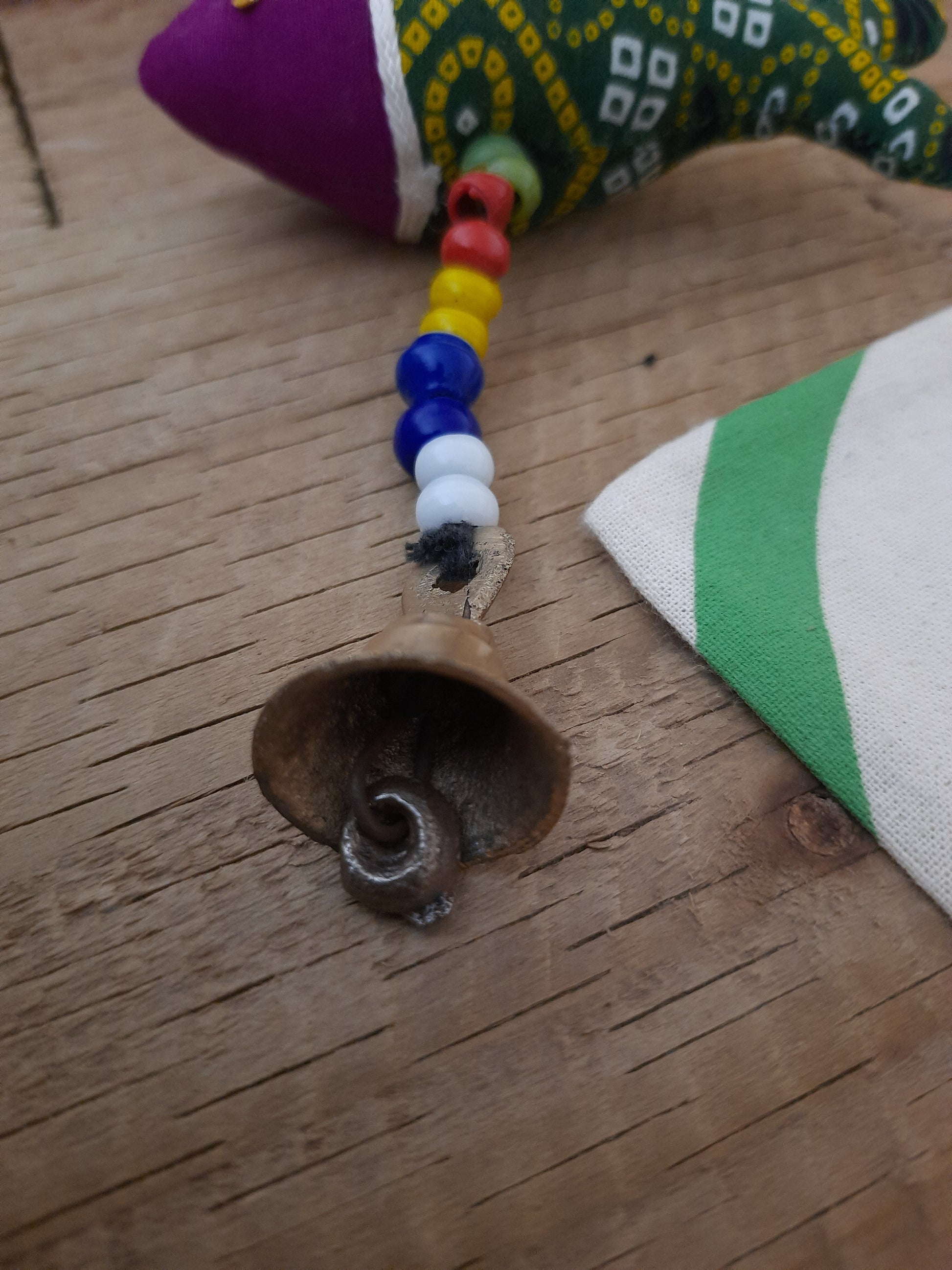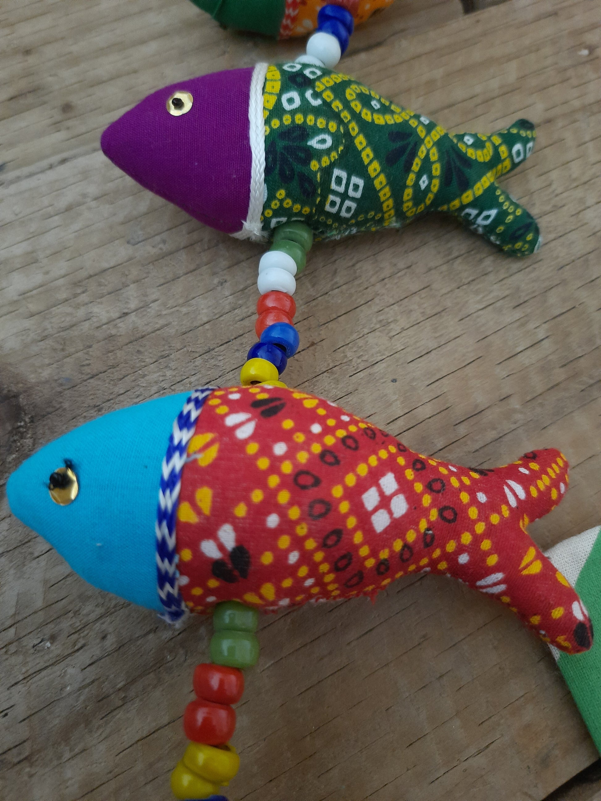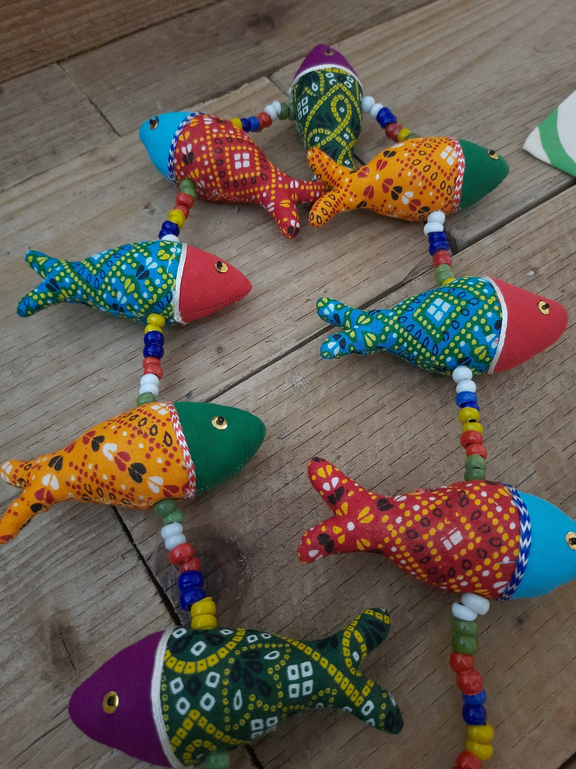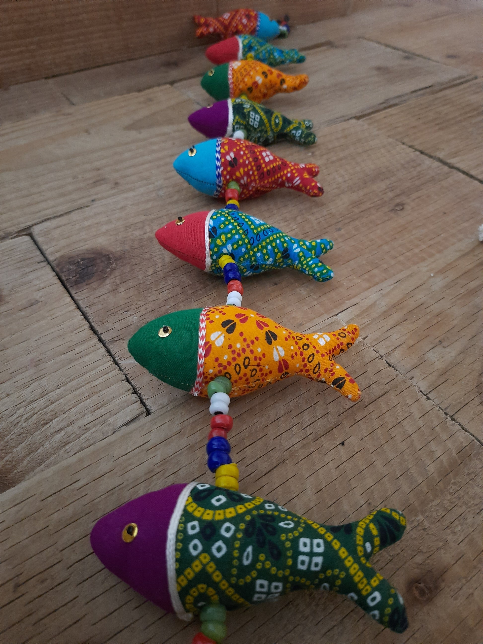 Made by fair trade artisans, each tota bell has 8 colourful fish, attached to colourful beads with a brass bell at the base.