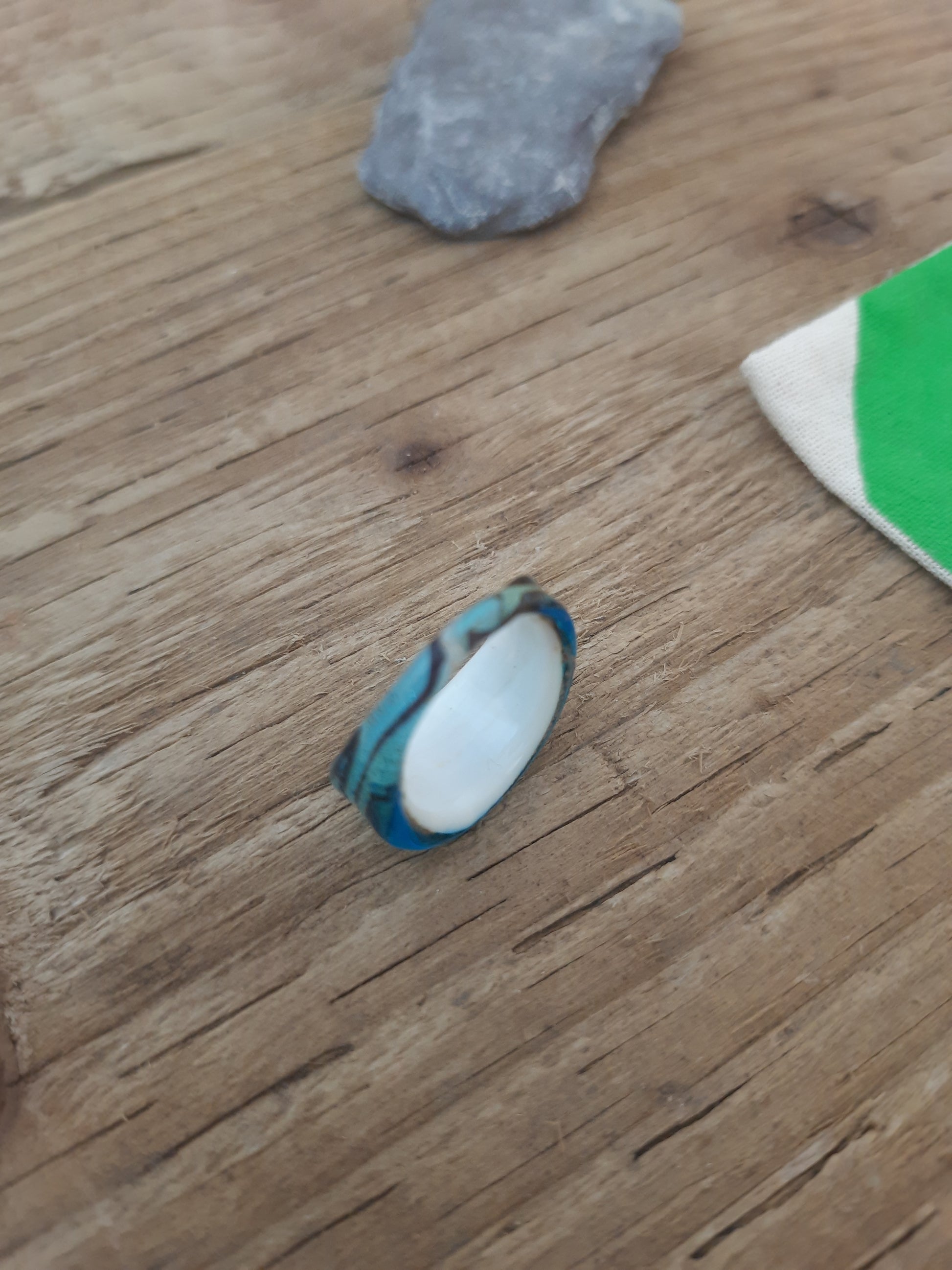 Lovingly made by skilful artisans in India in beautiful sky blue with an element of black streaks across the facial this cute ladies hand ring will certainly hold its own.